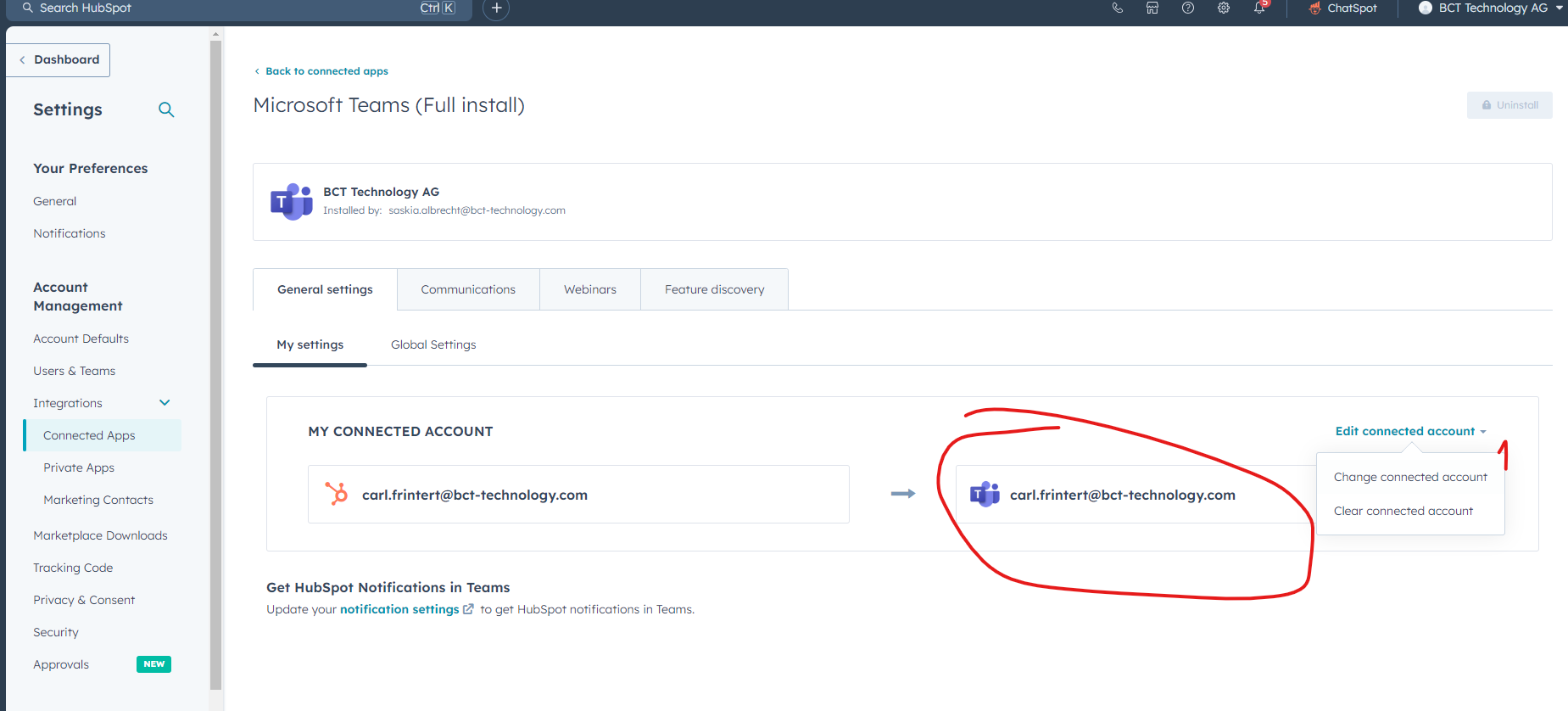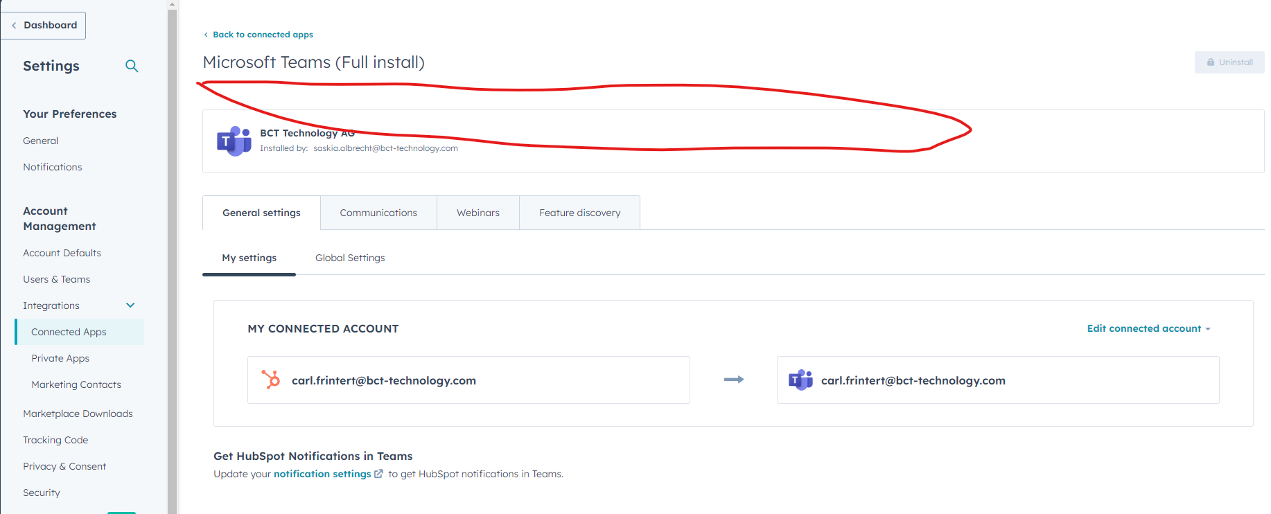 Go to Hubspot to your settings / Account Management / Integration / Connected Apps and search for Teams. See picture
