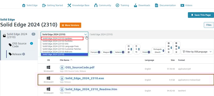 For Solid Edge, you will also find the Full Installer in the download area and the corresponding updates for the selected software version in the dropdown:
